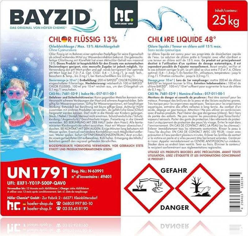 POOL CHLOR März 2026 Produktinformationen "25 kg BAYZID Chlor 13% Flüssigchlor im 25-kg-Kanister zur effektiven Desinfektion von Schwimmbädern Neu und ungeöffnet Nur Abholung möglich
