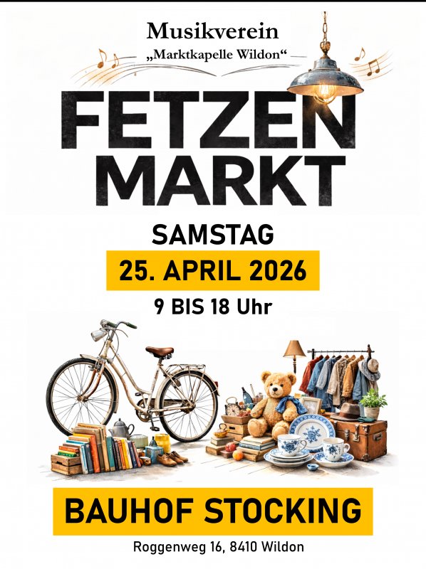 Großer FLOH- und FETZENMARKT des MV Wildon am Samstag, 25. April 2026 von 9 bis 18 Uhr beim Bauhof Stocking. Komm-Schau-Kauf!