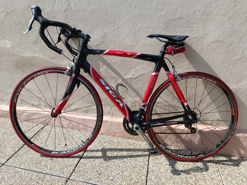 Verkaufe ein SIGA Team SLC Rennrad. -Vollcarbon Rennrad -Rahmengröße: 56cm -Schaltung: Shimano Ultegra -Bremsen: Shimano Ultegra -Tacho: Cateye CC-MC100W -Pedale: Klipps + normale Pedale gratis dazu. -Flaschenhalter: Carbon - Service-Tasche unter Sitz - G